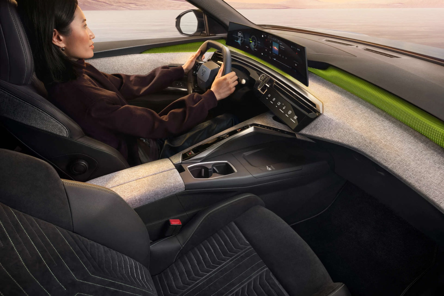 Розташований для досягнення оптимальної ергономіки, новий 21-дюймовий широкоформатний дисплей злегка вигнутий до водія, водночас залишаючись ідеально доступним для пасажира. Таким чином, надзвичайно велика панель для доступу в «цифровий світ автомобіля» органічно поєднує дві ключові складові концепції салону PEUGEOT i-Cockpit®: